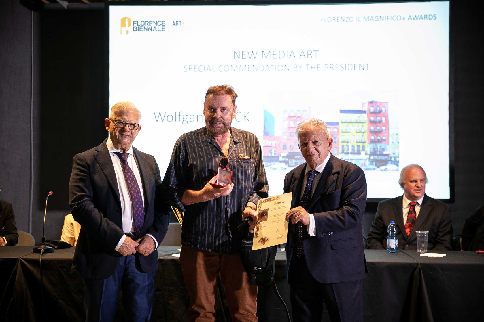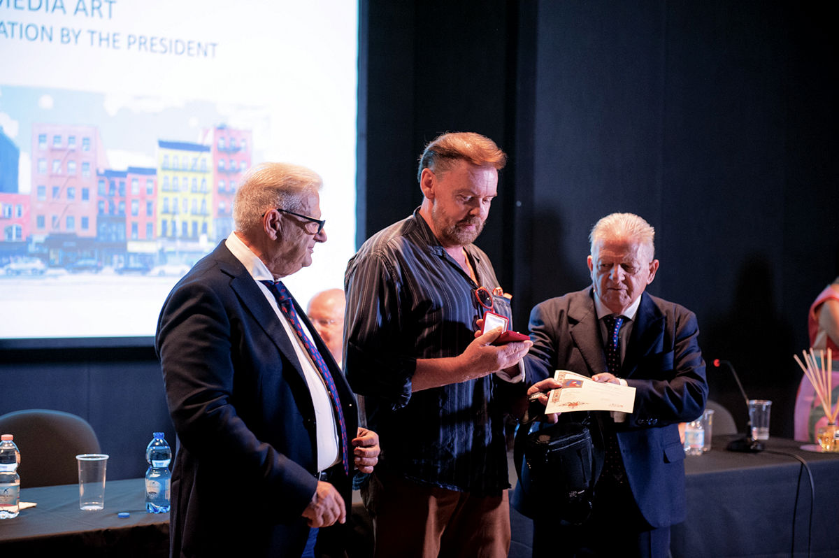 Die Preisverleihung: Links Piero Celona (Vice-Präsident), in der Mitte Wolfgang Hock und rechts Pasquale Celona (Künstler und Präsident der Biennale)