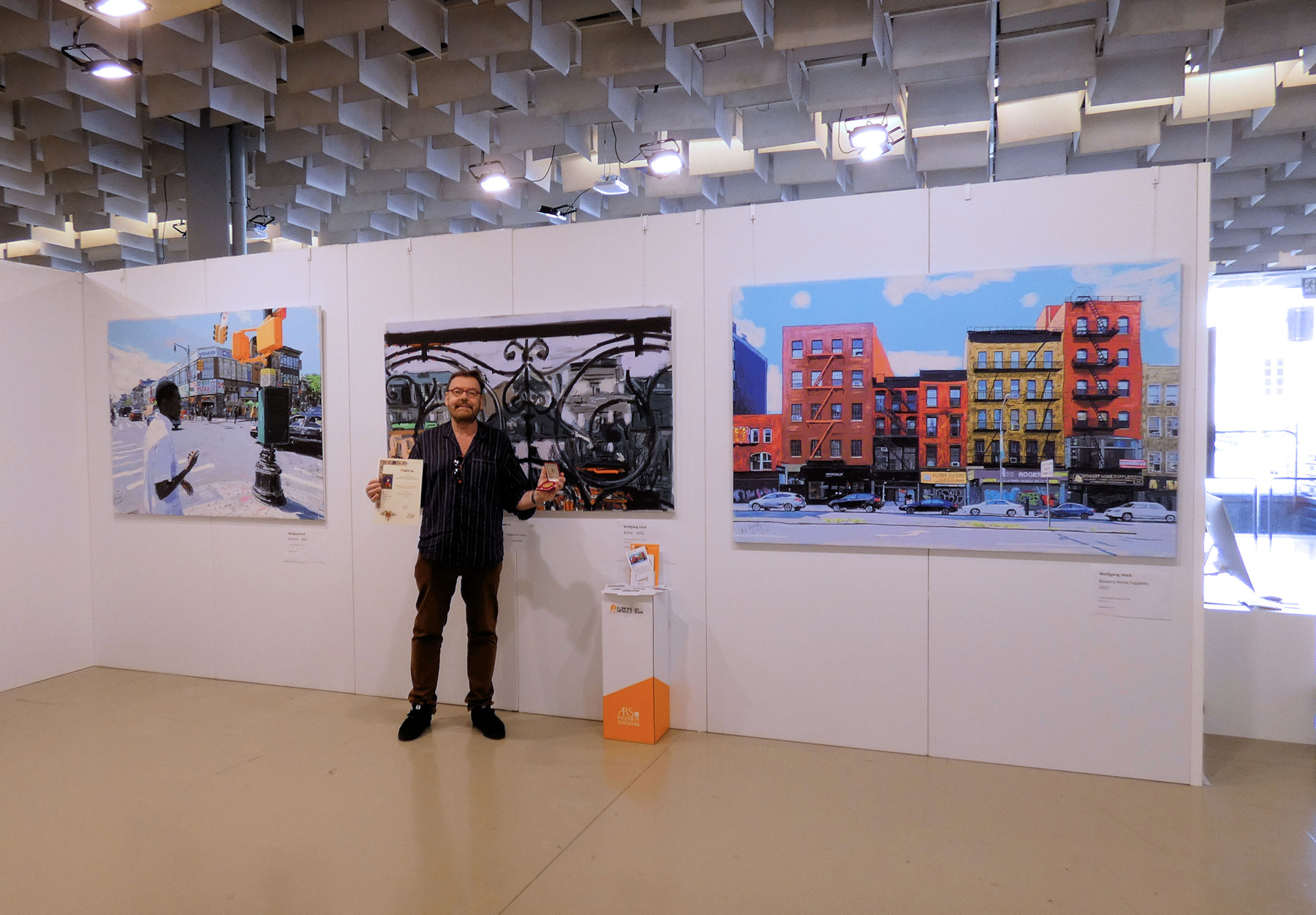 Wolfgang Hock bei seinen Bildern mit Urkunde und Medaille
